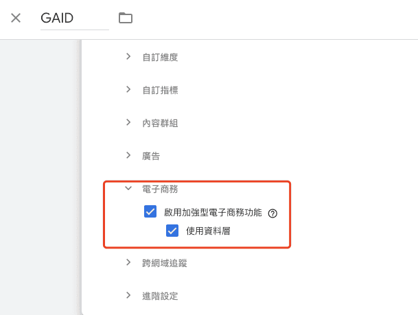 將 GAID 變數啟用電子商務,勾選使用資料層。